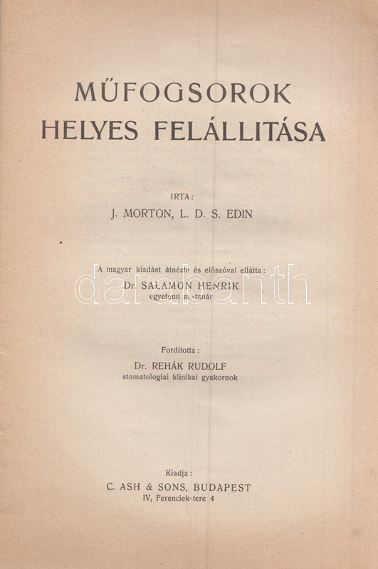 Műfogsorok helyes felállítása. A magyar ki... https://www.darabanth.com/en/466-Online-auction/466.0/Books/Books-Natural-sciences-Medicine~500044/Morton-J-Edin-L-D-S-Mufogsorok-helyes-felallitasa-A-magyar-kiadast-atnezte-es-elos~II3125676
