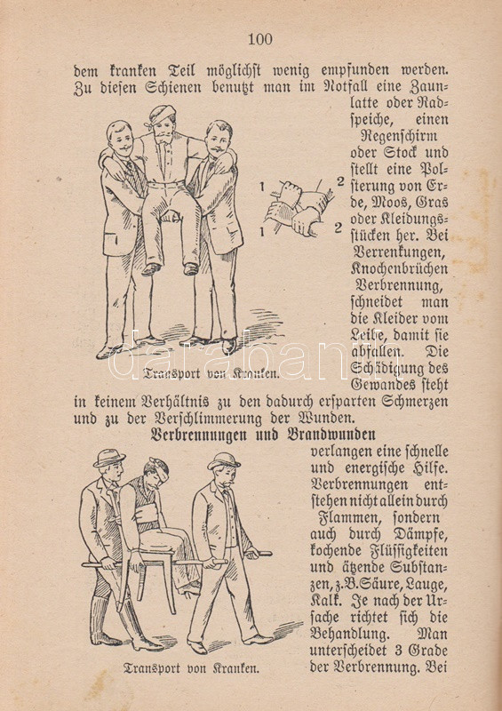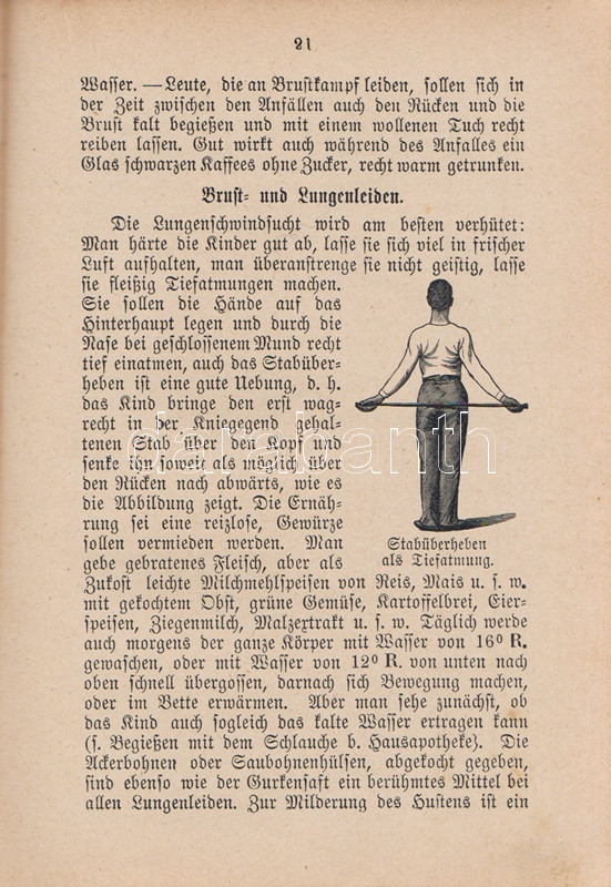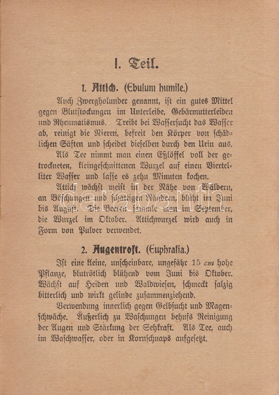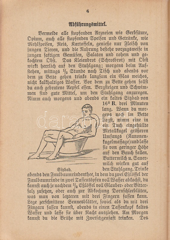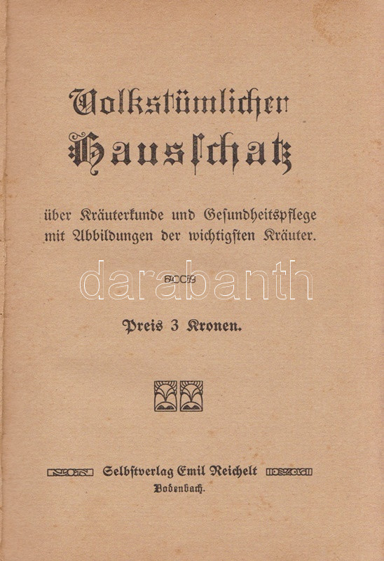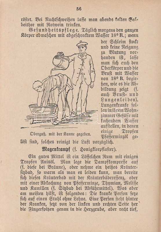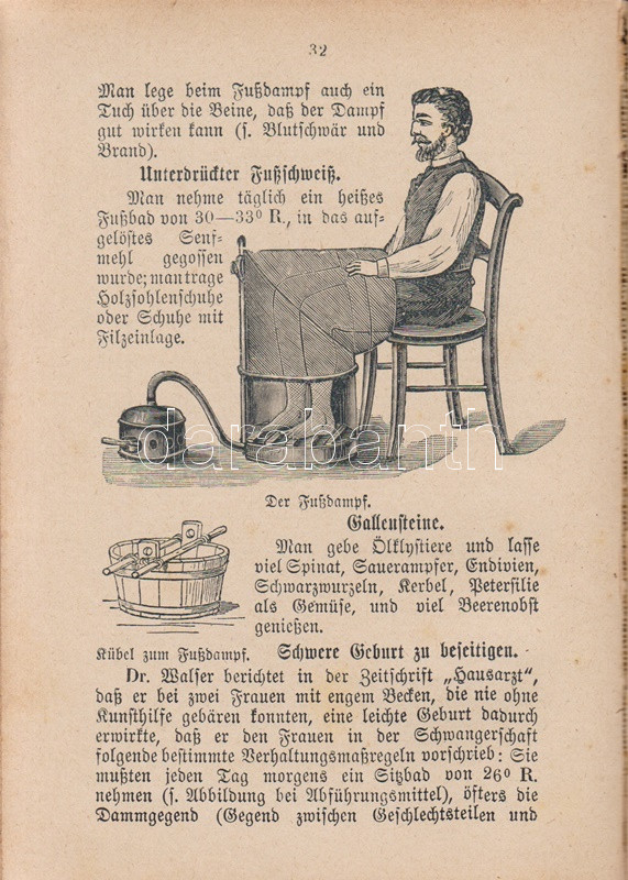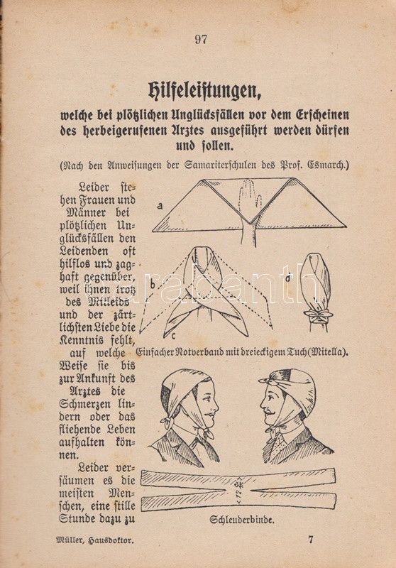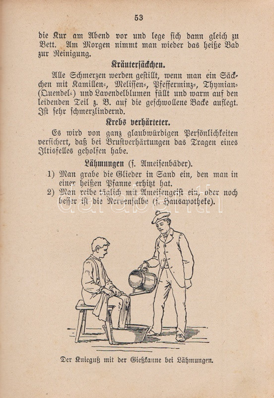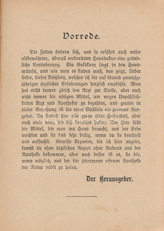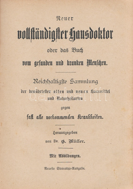 Müller, G. (szerk.): Neuer vollständigster Hausdoktor, oder das Buch vom gesunden und kranken Menschen. Reichhaltigste Sammlung der bewährtesten alten und neuen Hausmittel und Naturheilarten gegen fast alle vorkommenden Krankhetien. Herausgegeben von Dr. G. Müller. Mit Abbildungen. Neuster Stereotyp-Ausgabe. [Nürnberg, 1910 körül. Hempfling Verlag (ny. n.)] 128 p. Német nyelvű népies háziorvosi útmutatónk a családi nyavalyákra a századforduló környékén elterjedt természetgyógyászati eljárásokat ajánl: vízgyógyászati eljárásokat ajánl, különféle gyógyító leöntéses eljárásokat ismertet oldalszámozáson belül szövegközti ábrákkal kísérve. A részletes tárgymutató után ábrákkal kísért elsősegély-nyújtási tudnivalók. G. Müller orvosi tanácsadója elé kötve a ,,Volkstümlicher Hausschatz über Kräuterkunde und Gesundheitspflege mit Abbildungen der wichtigsten Kräuter" címet viselő gyógyfüves népi gyógyászati könyvecske 45 + [3] p. terjedelmű első fejezete (Selbstverlag Emil Reichelt, Bodenbach, 1910 körül). A hátsó kötéstáblán az egykori tulajdonos magyar nyelvű házi feljegyzései. Korabeli, enyhén foltos félvászon kötésben, az első kötéstáblán színes kőnyomatú illusztrációval.
