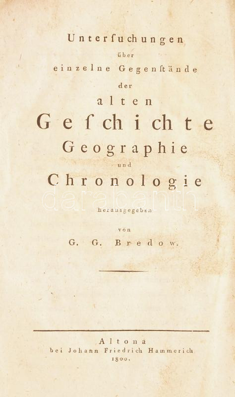 Description: Bredow, G[abriel] G[ottfried]: Untersuchungen über einzelne Gegenstände der alten Geschichte, Geographie und Chronologie. Altona, 1800. Hammerlich 184 p. 1 . kötet Korabeli papírborítóval.