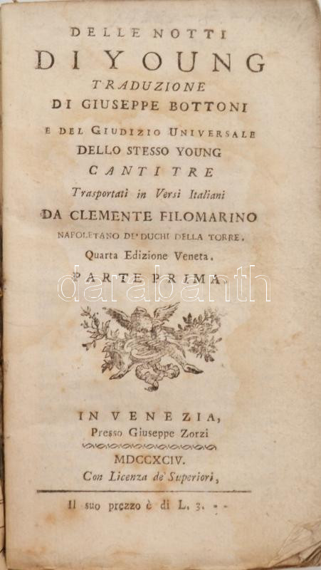 Description: Delle notti di Young. Traduzione di Giuseppe Bottoni e del Giudizio Universale dello stesso Young. Cante prima. Venezia, 1794. Giuseppe Zorzi. XVI. + 332p. Korabeli papírborítóval, néhány lap kijár.