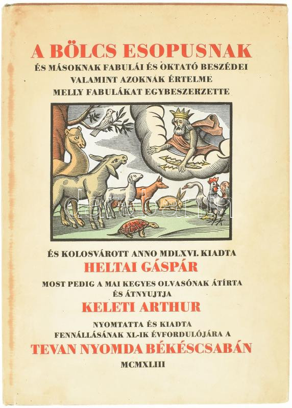 A Bölcs Esopusnak és másoknak fabulái és oktató beszédei, valamint azoknak értelme melly fabulákat egybeszerzette és Kolosvárott anno MDLXVI. kiadta Heltai Gáspár, most pedig a mai kegyes olvasónak átírta és átnyujtja Keleti Arthur. Tevan amatőr-sorozat 13. Békéscsaba, 1943, Tevan Nyomda, 155+5 p. Korda Géza fametszeteivel illusztrált. Kiadói kissé kopott félvászon-kötés, kiadói foltos, kissé szakadt papír védőborítóban. Számozott (1028./1200) példány.