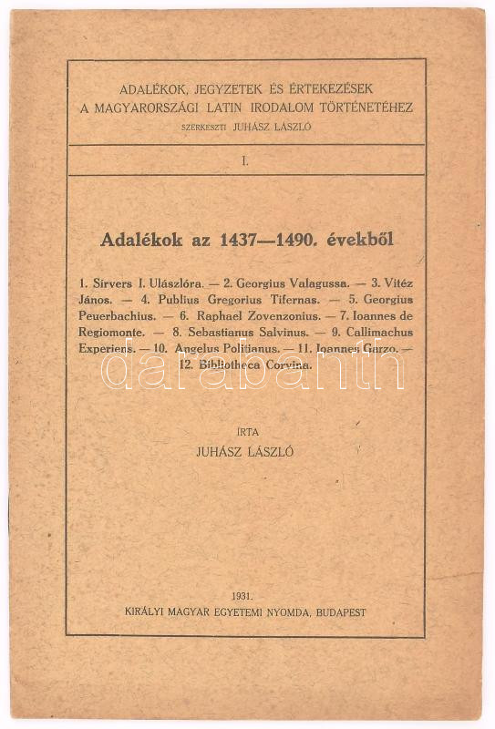 Description: Adalékok jegyzetek és értekezések a magyarországi latin történetéhez. I.: Juhász László: Adalékok az 1437-1490. évekből. Bp., 1931, Kir. M. Egyetemi Nyomda, 18 p. Kiadói papírkötés.