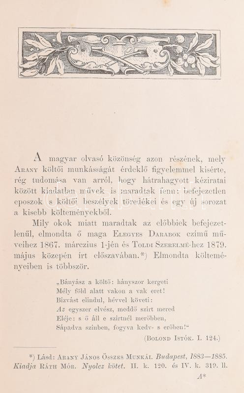 Description: Arany János levelezése író-barátaival. I. kötet. A szülőház és Nagy Szalonta látképével. Arany János hátrahagyott iratai és levelezése. III. köt. Levelezés I. köt. Bp., 1888., Ráth Mór, 1 t.+XIX+494+1 p.+2 (kihajtható kézirat hasonmások) t. Kiadói aranyozott gerincű félbőr-kötés, aranyozott lapélekkel, kopásnyomokkal. + versei kötet címlap nélkül 556p.