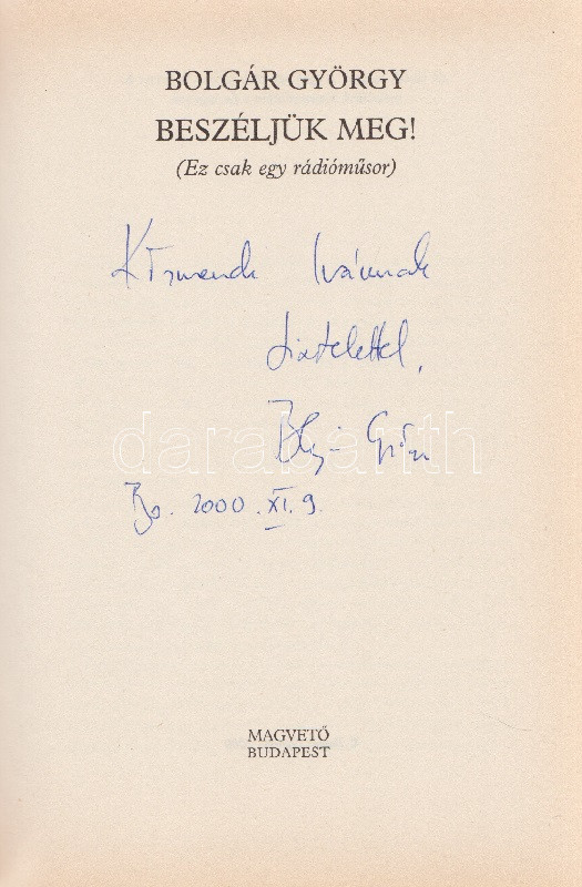 ... https://www.darabanth.com/en/466-Online-auction/466.0/Books/Books-Other-rarities~500042/Bolgar-Gyorgy-Beszeljuk-meg-Ez-csak-egy-radiomusor-Dedikalt-Budapest-2000-Magvet~II3127881
