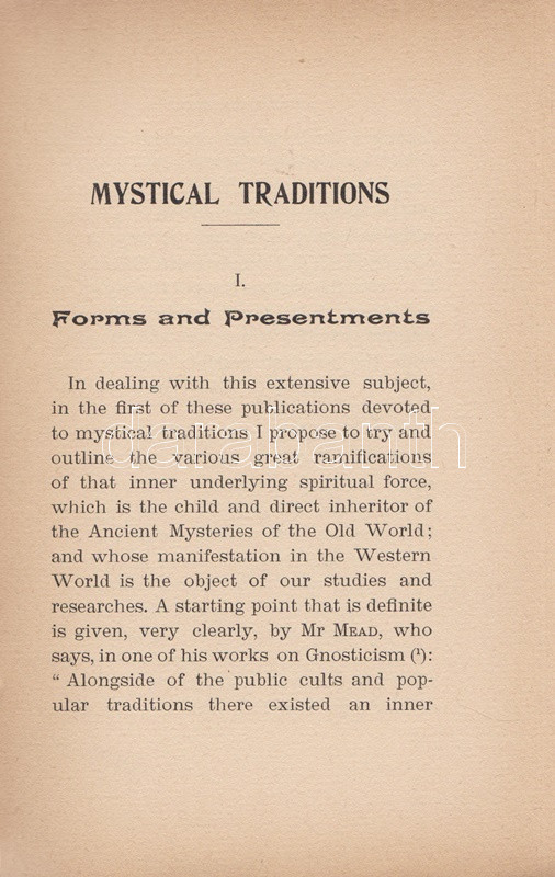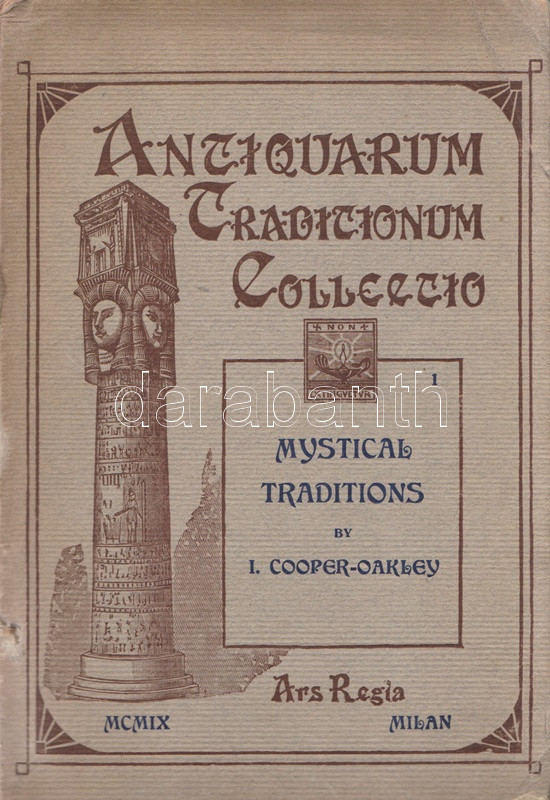 Cooper-Oakley, Isabel: Mystical Traditions I-II. Forms and Presentments. Secret Writings and Ciphers.[Teljes, egybekötve.] [Milánó] Milan, 1909. Libreria Editrice ,,Ars Regia" (Printed by A. Koschitz & Co.) 310 + [10] p. Első kiadás. Isabel Cooper-Oakley (1854-1914) teozófus, teozófiai író történeti összefoglalása az ókori keleti misztikus tanok Nyugaton való meghonosodásáról. A szerző véleménye szerint a titkos gnosztikus tanok továbbörökítésében az arab kivonatolók éppúgy közreműködtek, mint a középkori trubadúrok, az albigensekhez hasonló eretnek mozgalmak, illetve az olasz neoplatonista akadémiák. Az első nyomtatott oldalon régi tulajdonosi bélyegzés, a címoldalon tulajdonosi jegyzet. Poss.: Gyöngyöshalászy Takách Zoltán [Gyöngyöshalászy Takách Zoltán magyar származású zongoraművész, zongoratanár és zeneszerző. A budapesti Zeneakadémián tanult művész az 1900-as évek első évtizedében magas rangú magyar diplomaták ajánlásával került az amerikai komolyzenei élet sodrába - az amerikai keleti part nagyvárosaiban, New Yorkban, Philadelphiában és az amerikai elit üdülőhelyein lépett fel, egyúttal magán zeneiskolát is fenntartott Amerikában.] Fűzve, illusztrált, enyhén sérült kiadói borítóban. Körülvágatlan, jó példány.