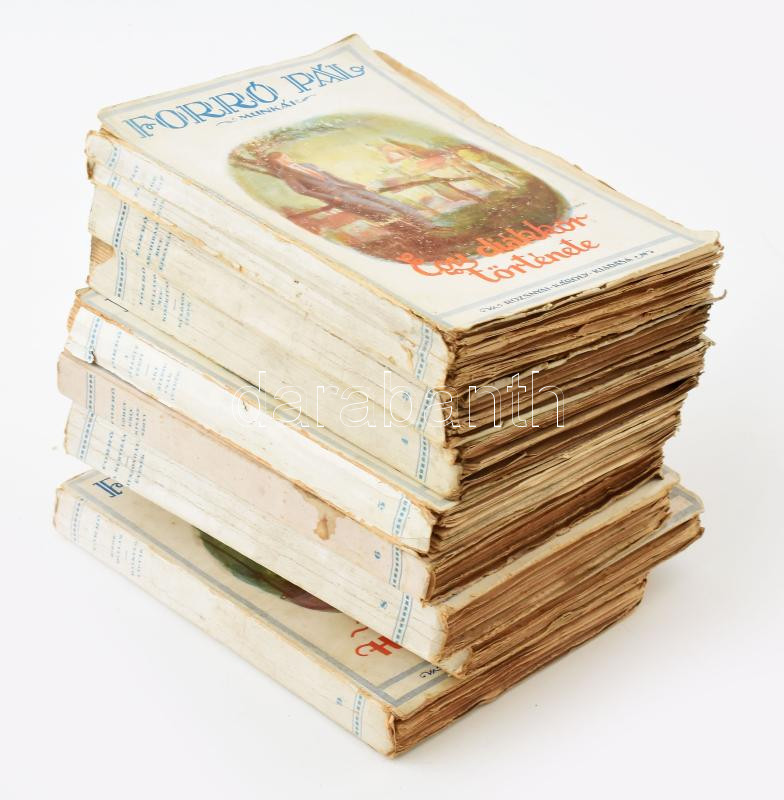 Forró Pál munkái 8 darab könyve, Rozsnyai Károly kiadása. Egy diákkor története, Archibald Rice éjszakái, Giulianó megkísértése, A züllött férfi, Lohengrin kisasszony, A kurtizán, Biborhullám, Kegyetlen asszonyok. Sérült kötés, foltok.