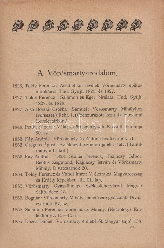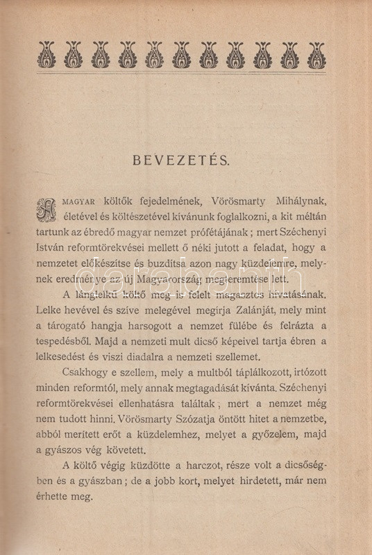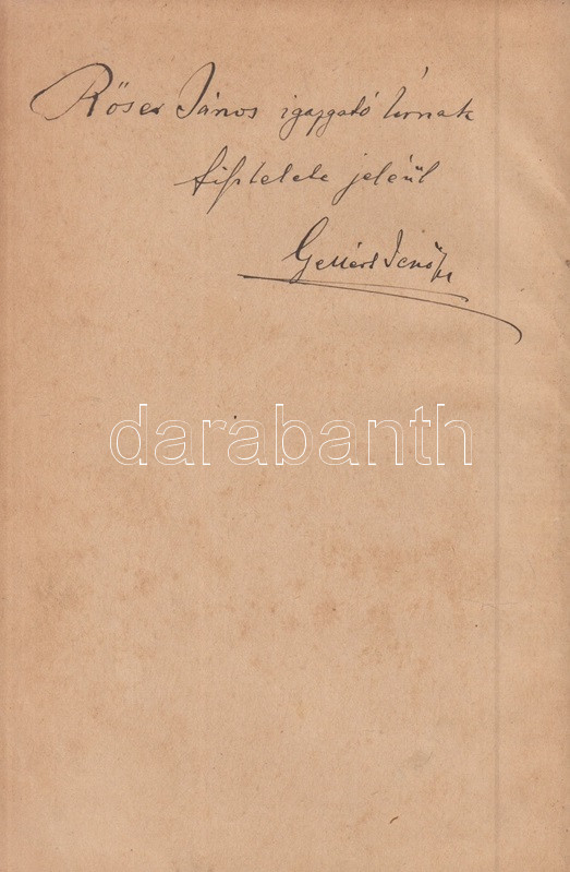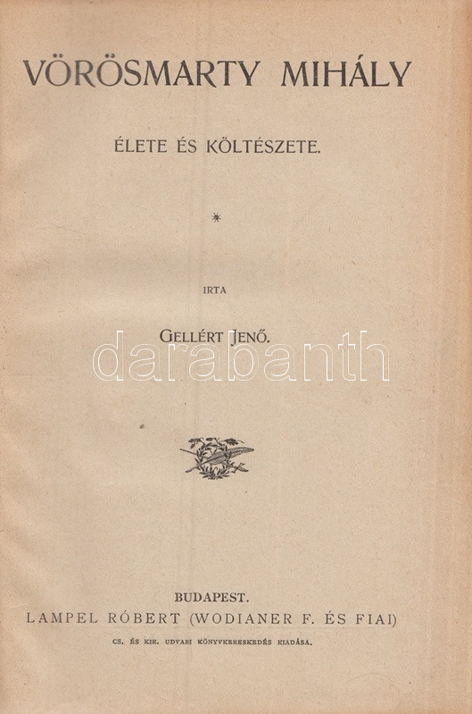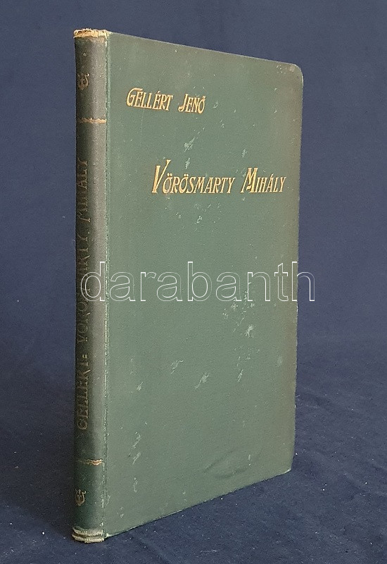Gellért Jenő: Vörösmarty Mihály élete és költészete. (Dedikált.) Budapest, (1901). Lampel Róbert (Wodianer F. ás Fiai) (ny.) 1 t. (hártyapapírral védett címkép) + 141 + [3] p. Első kiadás. Dedikált: ,,Röser János igazgató úrnak tisztelete jeléül Gellért Jenő". Részlet az előszóból: ,,Könyvem közrebocsájtását csupán a cél indokolhatja, melyet szolgálni kíván. Célom pedig az, hogy előkészítsem olvasóimat arra, hogy Gyulai Pál klasszikus munkáját - mely olvasójáról fölteszi Vörösmarty műveinek ismeretét - haszonnal olvashassák és élvezhessék. Különösen a tanuló ifjúságnak akarok szolgálatot tenni. Ez okból kiváló súlyt fektettem az egyes művek tartalmának részletes közlésére." - A művek tartalmi kivonatolása a korszak irodalomtörténeti munkáinak jellemző, praktikus, diákok által kedvelt eljárása; a munkának egy évvel később bővített kiadása is megjelent. Poss.: Röser János. [Röser János (1844-1918) könyvvitel- és számtan-tanár, a Röser-féle nyilvános gimnázium, polgári és felsőkereskedelmi iskola (Budapest, VI., Aradi utca 8-10.) igazgatója.] Aranyozott, vaknyomásos korabeli egészvászon kötésben (Müller Gy., Budapest). Jó példány.