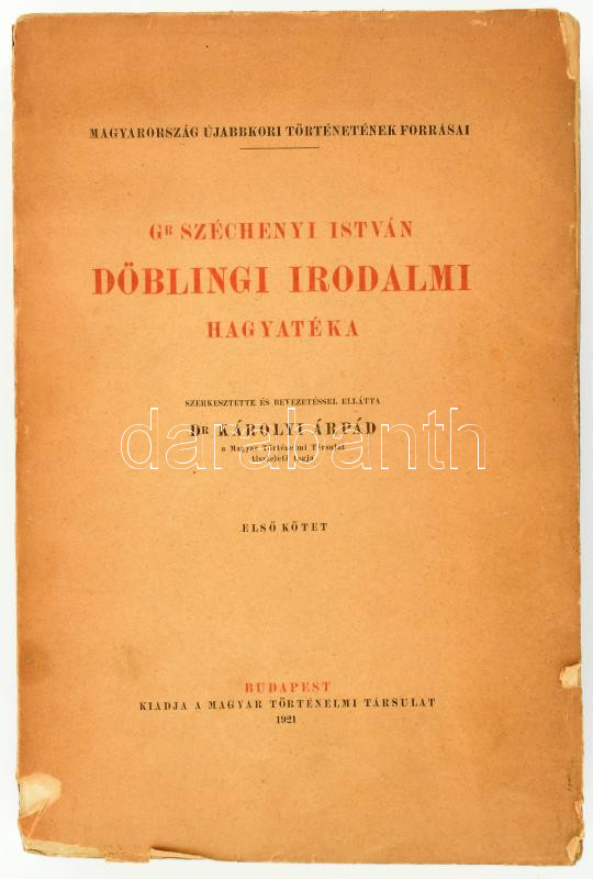 Description: Gróf Széchenyi István döblingi irodalmi hagyatéka. I. köt. Szerk. és bev. ellátta: Károlyi Árpád. Gróf Széchenyi István összes munkái 7 köt. Bp., 1921, Magyar Történelmi Társulat. Kiadói papírkötés, szakadt borítóval, kissé laza fűzéssel.