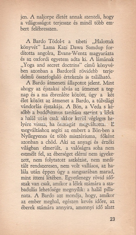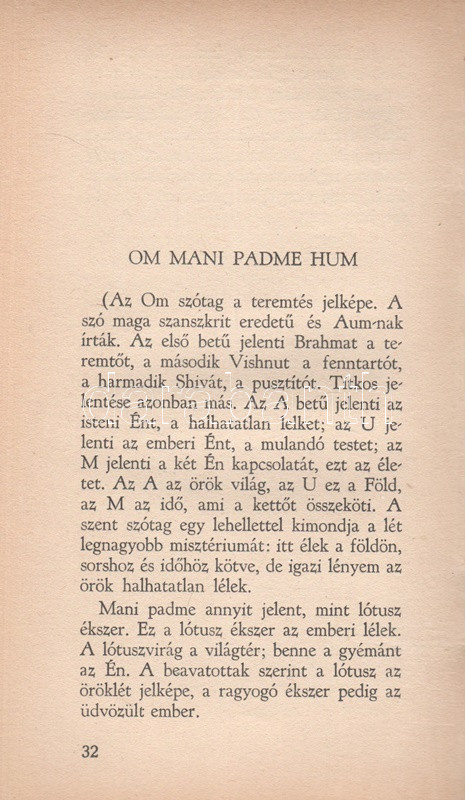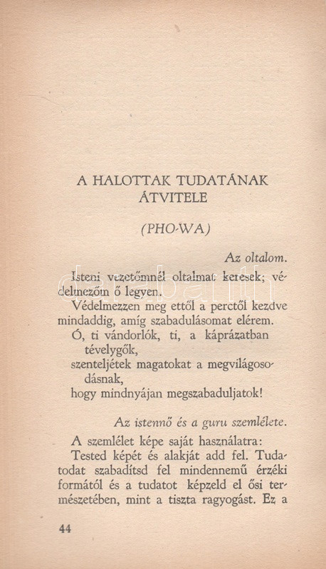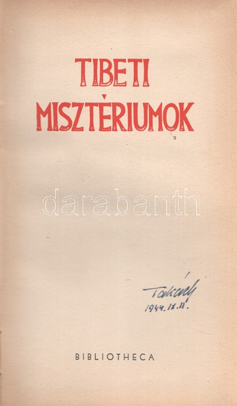 Hamvas Béla [ford.]: Tibeti misztériumok. Fordította és bevezetéssel ellátta: Hamvas Béla. (Budapest, 1944). Bibliotheca (Antiqua Nyomdai és Irodalmi Rt.) 135 + [1] p. Első kiadás. ,,A tibeti buddhizmus lámaizmus néven ismert. Hit- és dogmarendszerét, legfontosabb szentjeit, szervezeti felépítését, szertartásait nagyobbrészt a buddhizmustól örökölte, de sok minden őrződött meg benne az ősi hiedelmekből, varázslatokból, a bon misztériumaiból is. Tanításait nem egyetlen szentkönyvben összegezték, a legtekintélyesebb mesterek tanításait gyűjtötték és másolták a lámaista kolostorokban. Ezekből válogatott a kötet fordító szerkesztője, Hamvas Béla. (A fordítás eredeti szövegek alapján készült, de szükség szerint rövidítve került közlésre.) Így e könyvből megismerhetjük a tibeti vallás alapvető tanításait, a tanításokhoz kapcsolódó imákat, szertartásokat, misztikus eljárásokat, aszketikus gyakorlatokat. Áttekintést kapunk leglényegesebb fogalmairól, bepillanthatunk titkos módszereibe. Hamvas nem a vallás látványos-misztikus elemeit ragadta ki, az ő célja s teljes hit- és dogmarendszer bemutatása volt. Ezt segíti bevezető tanulmánya, melyben kitér a lámaizmus történetére is." A kötet végén tibeti és szanszkrit szavak jegyzékével. Kiadói, első kötéstábláján Mészáros Tamás rajzával illusztrált papírkötésben, jó példány.