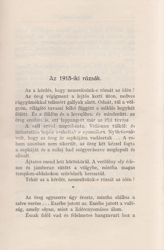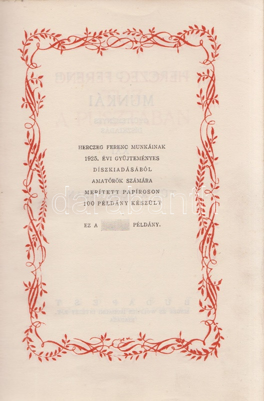 Kolofon: ,,Herczeg Ferenc munkáinak 1925. évi gyűjteményes díszkiadásából amatőrök számára merített papíroson 100 példány készült". Példányunk számozása kitöltetlen.