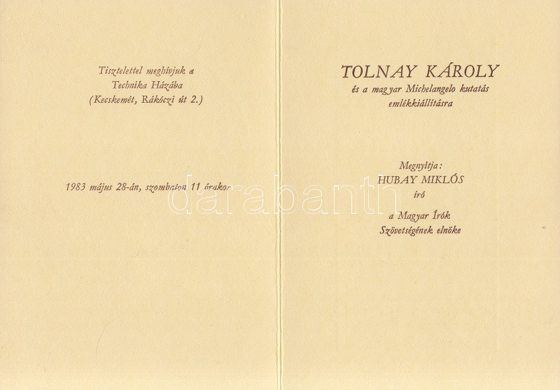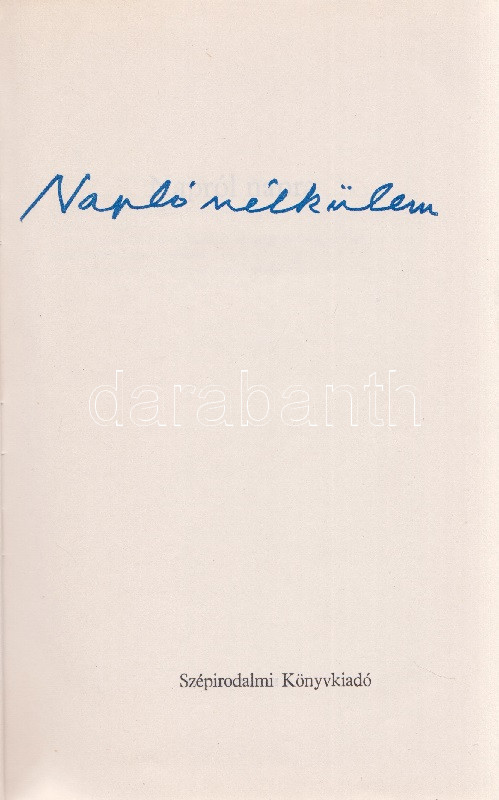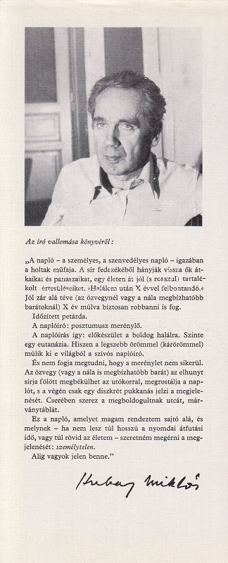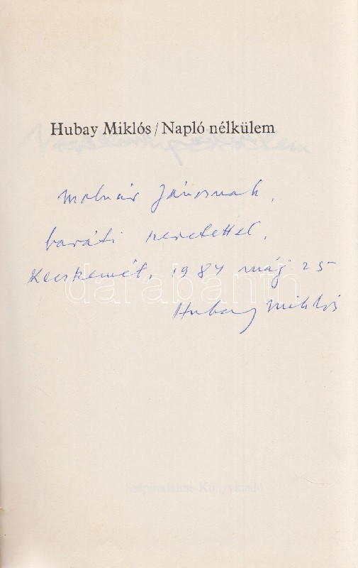 Hubay Miklós: Napló nélkülem. [Budapest], (1978). Szépirodalmi Könyvkiadó (Dürer Nyomda, Békéscsaba). 437 + [1] p. Egyetlen kiadás. Dedikált: ,,Molnár Jánosnak, baráti szeretettel. Hubay Miklós. Kecskemét, 1984. máj. 25." A kötetben elhelyezve Hubay Miklós és Molnár János közös portréja. Vintázs, ezüst nagyítású felvétel, mérete: 120x165 mm, készítette Bahget Iskander fotógráfus, 1983. május 28-án, Kecskeméten, a ,,Tolnay Károly és a magyar Michelangelo-kutatás" című emlékkiállításon, melyen a megnyitó beszédet Hubay Miklós tartotta. Mellékelten a kiállítás illusztrált, kihajtható meghívója. Prov.: Molnár János. [Molnár János kecskeméti helytörténész, népművészeti gyűjtő, könyvgyűjtő.] Aranyozott, kiadói egészvászon kötésben, színes, illusztrált, enyhén kopott kiadói védőborítóban. Jó példány.