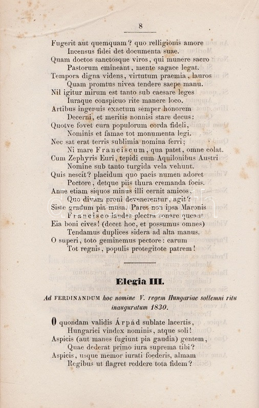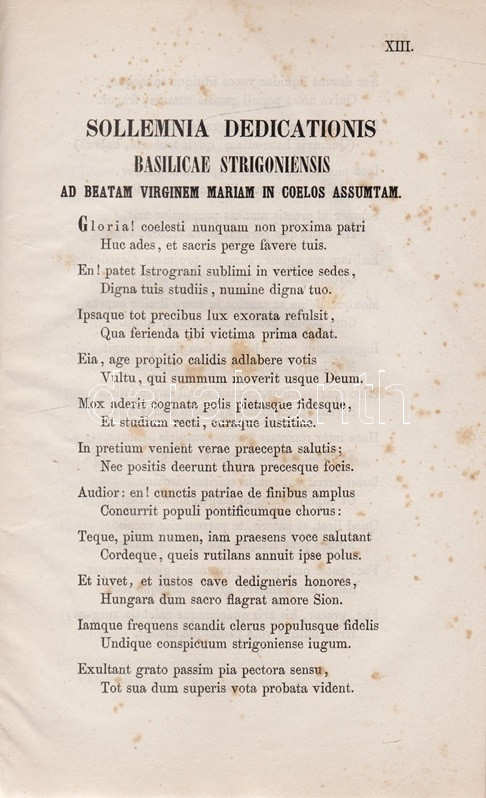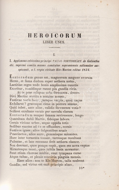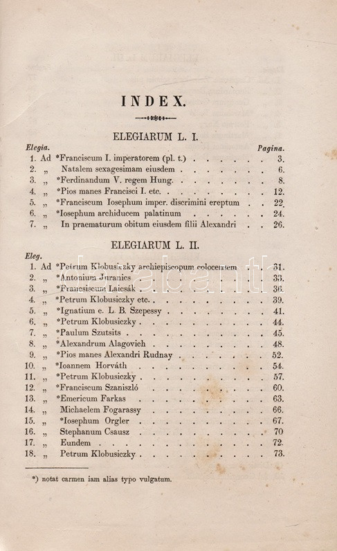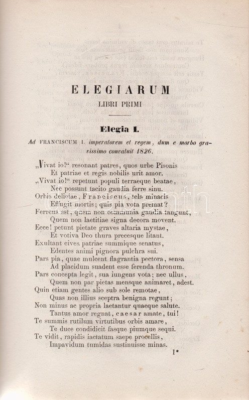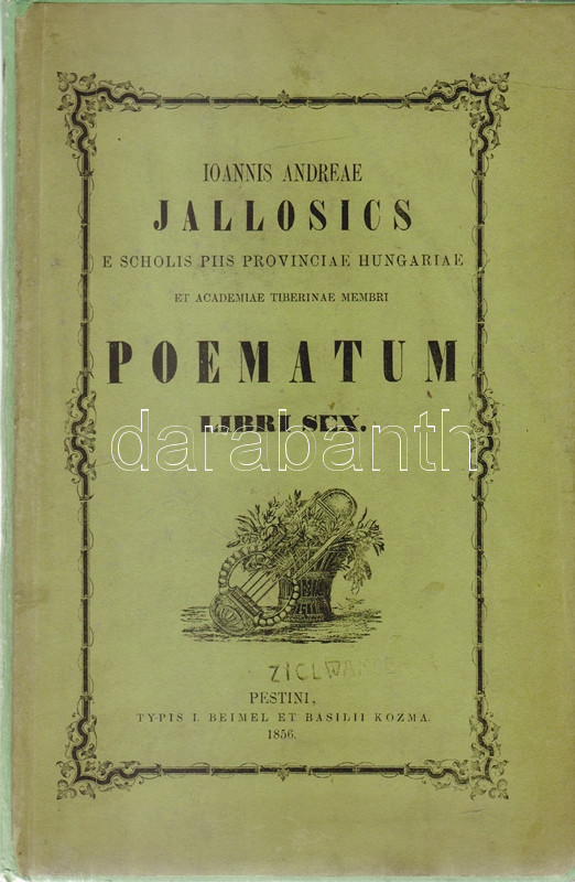 Jallosics András: Ioannis Andreae Jallosics [...] Poematum libri sex. Praemisso carmine sollemnitati dedicationis metropolitanae basilicae Strigoniesis. [Pest], Pestini, 1856. Typis Iosephi Beimel et Basilii Kozma. XXII + [8] + 260 + [4] p. Jallosics András piarista kormánysegéd és főgimnáziumi igazgató latin nyelvű elégiái, ódái és más verses darabjai a XIX. század első feléből. A retorikatanárként munkálkodó szerző némelyik költeményét, így például a kötetünkben szereplő alkalmatosságra írt versét, melyet Eszterházy Pál főispáni beiktatására írt, korábban magyarul is közreadta. A címoldalon és a kötéstáblán régi tulajdonosi bélyegzés, a tartalomjegyzékben néhány aláhúzás. Korabeli kartonkötésben, az illusztrált, keretdíszes első kiadói borító az első kötéstáblára ragasztva. Jó példány.