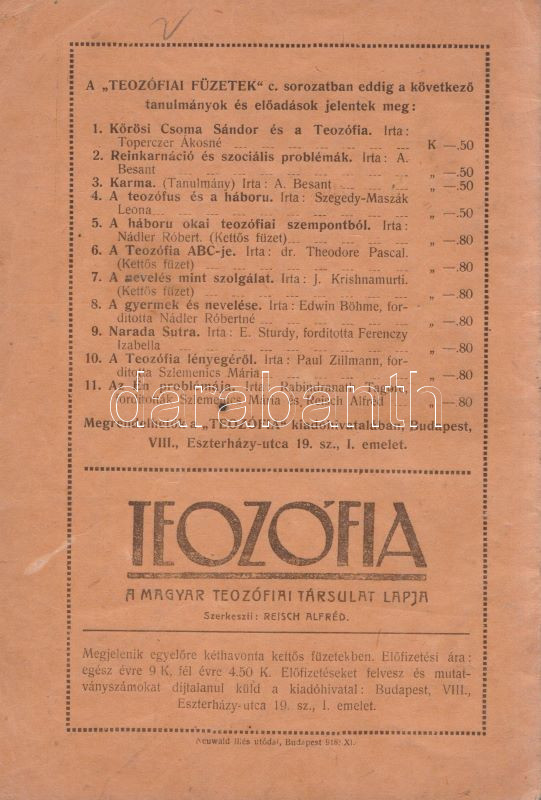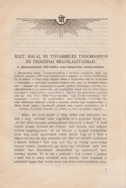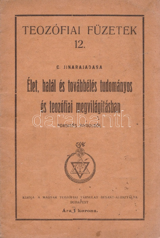 Jinarajadasa, C[uruppumullage]: Élet, halál és továbbélés tudományos és teozófiai megvilágításban. Fordítás angolból. Budapest, (1918). Magyar Teozófiai Társulat Besant-osztálya (Neuwald Illés utódai ny.) 20 p. Egyetlen magyar kiadás. A ceyloni születésű teozófus előadása 1916. október 8-án hangzott el, Glasgow városában, angol nyelven. Dokumentumunk az előadás leiratának magyar fordítása. Néhány oldalon halvány foltosság. (Teozófiai füzetek, 12. szám.) Fűzve, illusztrált, enyhén foltos kiadói borítóban. Jó példány.
