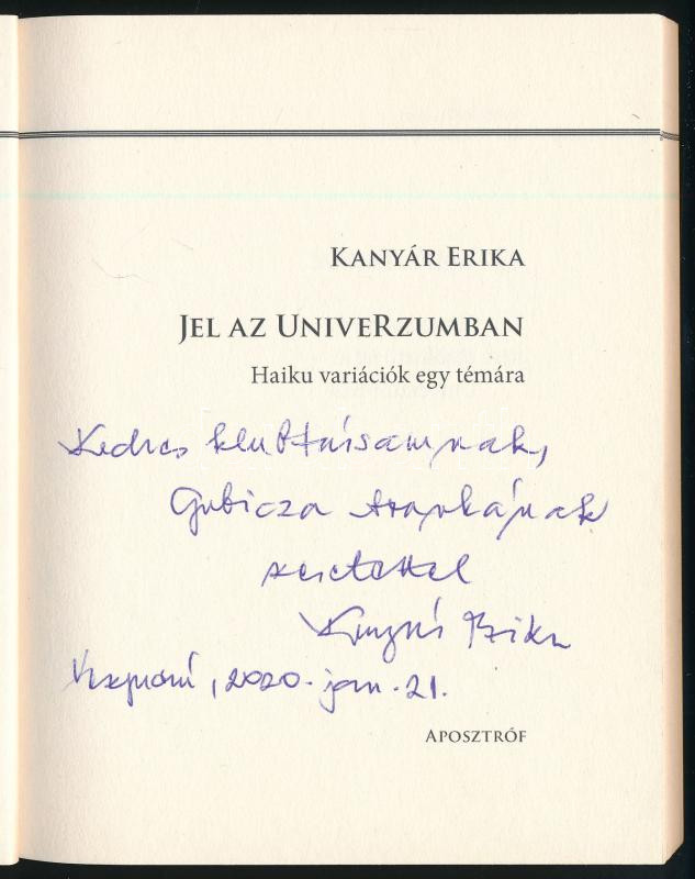 https://www.darabanth.com/en/466-Online-auction/466.0/Books/Books-Other-rarities~500042/Kanyar-Erika-Jel-az-univerzumban-Haiku-variaciok-egy-temara-DEDIKALT-hn-2016-Aposztro~II3142962