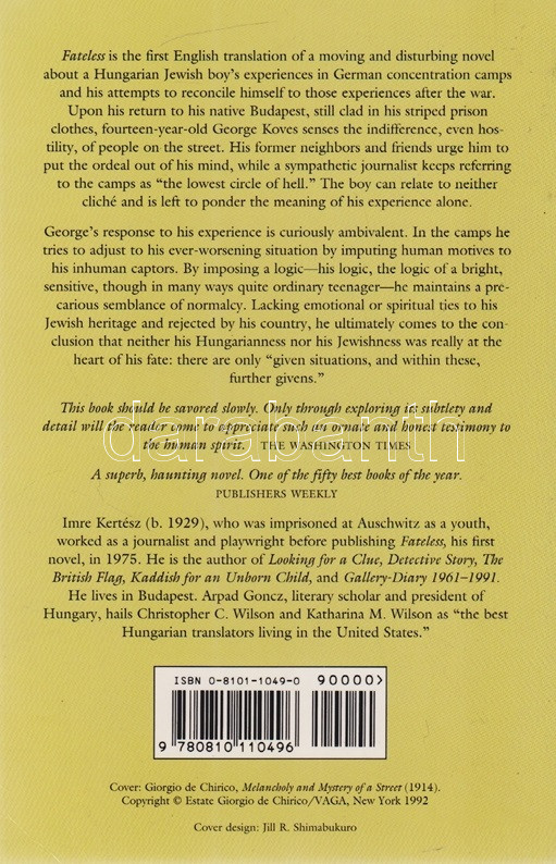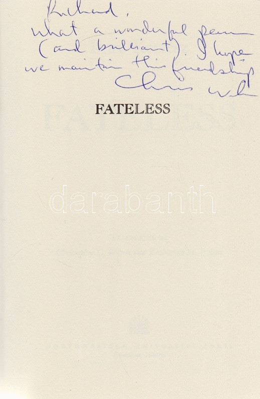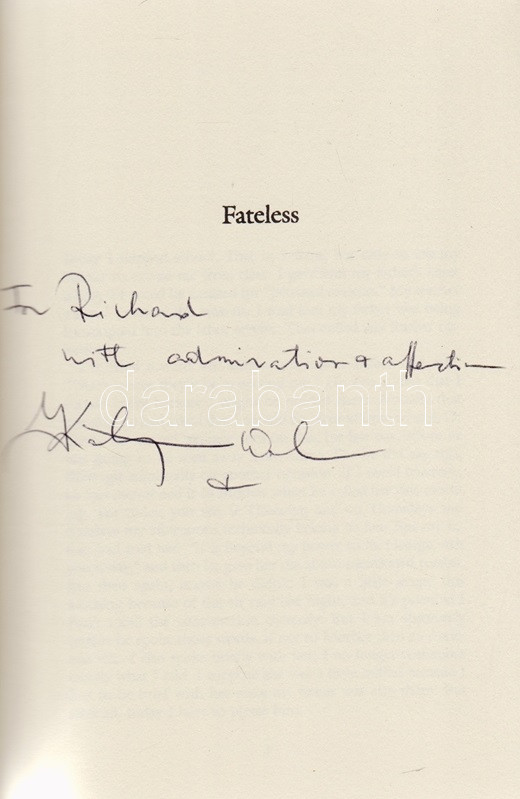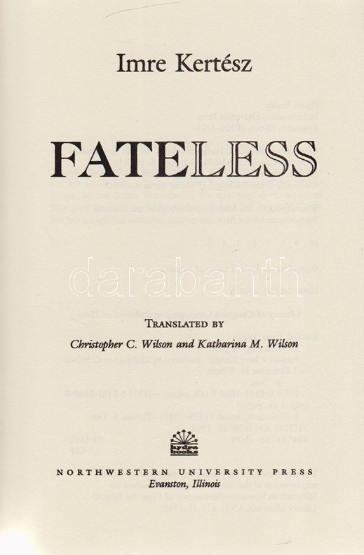 Kertész Imre: Fateless. Translated by Christopher C. Wilson and Katharina M. Wilson. (A fordítók által dedikált példány.) Evanston (Illinois, USA), 1997. Hydra Books - Northwestern University Press. [4] + 95 + [1] p. Egyetlen illinois-i kiadás. Kétszeresen dedikált példány: ,,Richard, What a wonderful gem (and brilliant). I hope we maintain this friendship. Chris Wilson". ,,For Richard, with admiration & affection. Kathy Wilson". Kertész Imre 1975-ben keletkezett regényének több angol nyelvű fordítása létezik, fordításunk a koraiak közül való. Prov.: Szentpéteri Nagy Richard alkotmányjogász, 1999-2010 között kormányzati és önkormányzati intézmény tanácsadója, később a Corvinus Egyetem, a Nemzeti Közszolgálati Egyetem oktatója, politikai elemző. Színes, illusztrált kiadói borítóban, a későbbi utánnyomásból származó példányunk első fedőborítóján ,,A Novel by the 2002 Nobel Prize Winner" felirattal. Jó példány. Ritka.