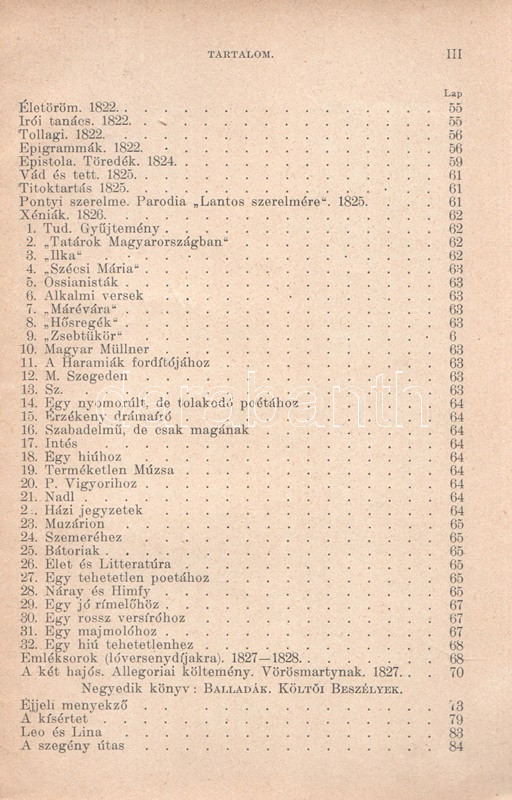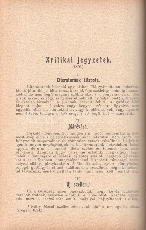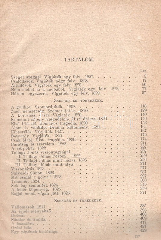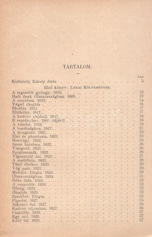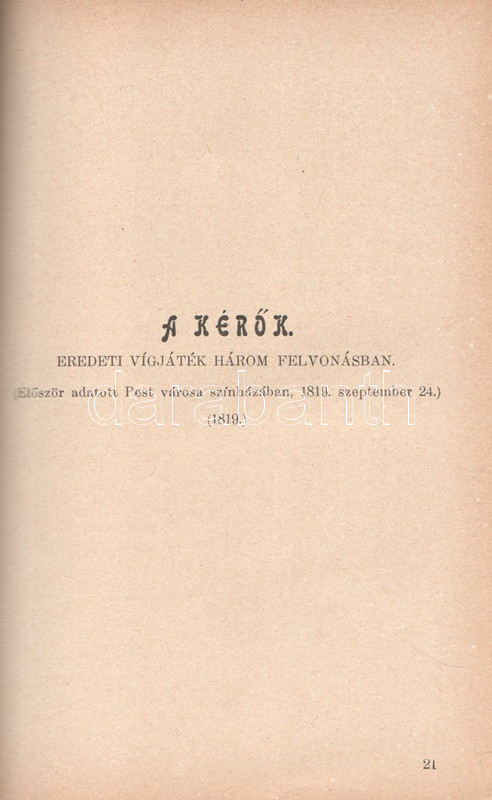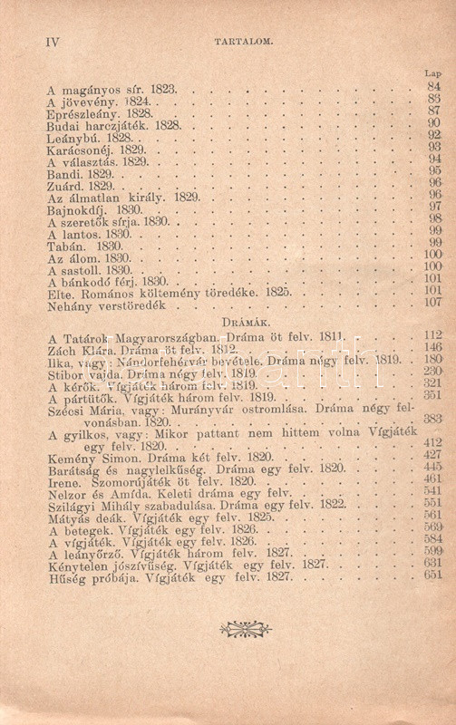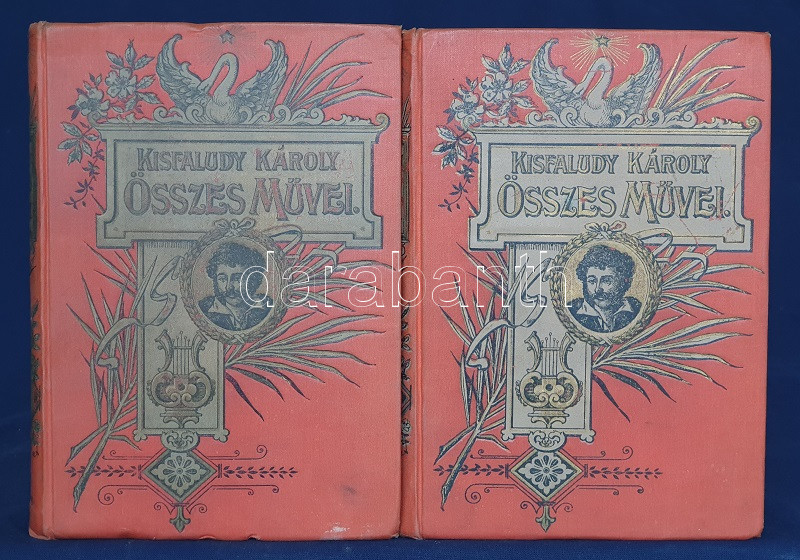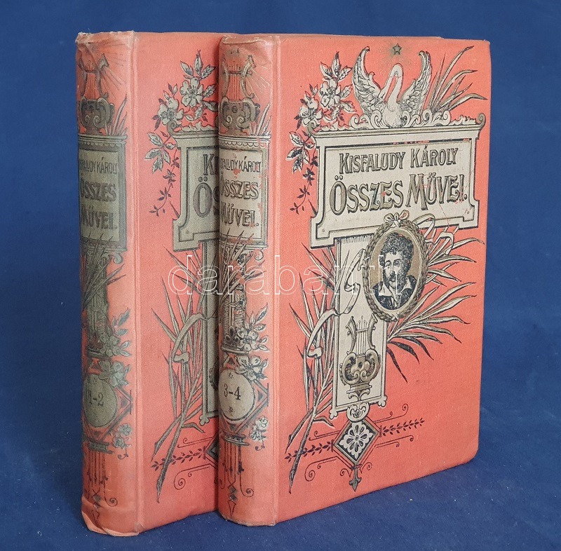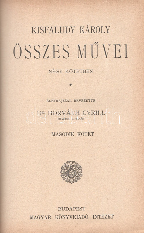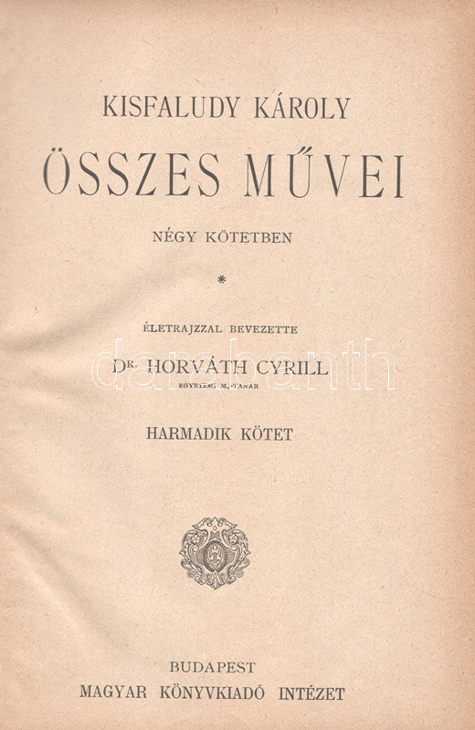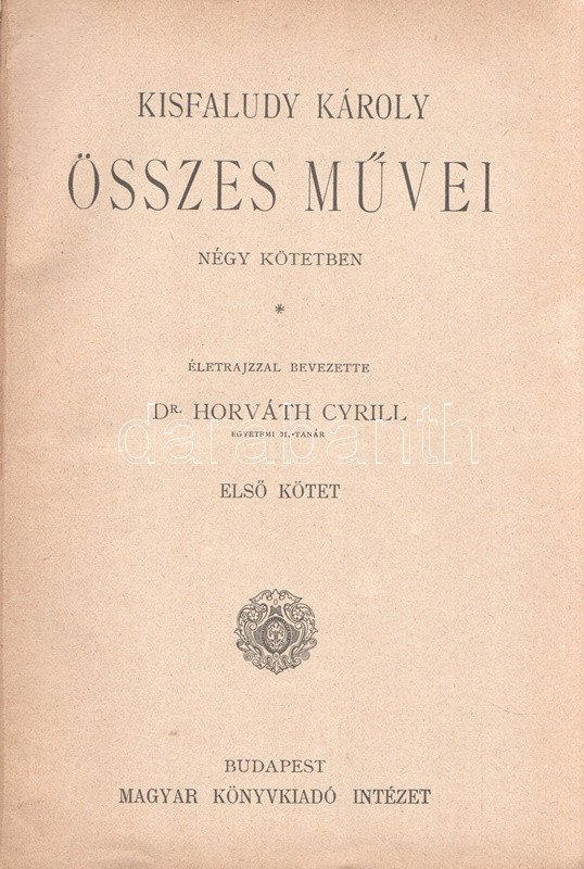 Kisfaludy Károly: Kisfaludy Károly összes művei négy kötetben. Életrajzzal bevezette Horváth Cyrill. Első-negyedik kötet. [Teljes mű két kötetbe kötve.] Budapest, [1899]. Magyar Könyvkiadó Intézet (Gönczi József ny., Szeged). 668 + IV p.; 674 + II p. A négykötetes mű törzsanyaga Kisfaludy Károly drámaírói életművét közli, a drámák után a drámatöredékeket és drámafordítását is beleértve. A drámák előtt Kisfaludy költői termése, a drámák után prózaírói és értekező munkássága, végül (részben német nyelvű) levelezése. Egységes, aranyozott, festett, vaknyomásos kiadói egészvászon kötésben. Jó példány.