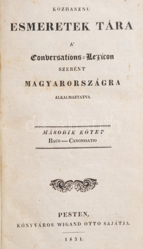 Közhasznú esmeretek tára. A' Conversations-Lexicon szerént Magyarországra alkalmaztatva. II köt.:Baco-Canonisatio. Pest, 1831, Wigand Ottó (Landerer-ny.), . Korabeli, aranyozott gerincű félbőr-kötésben, festett lapélekkel kopott gerinccel