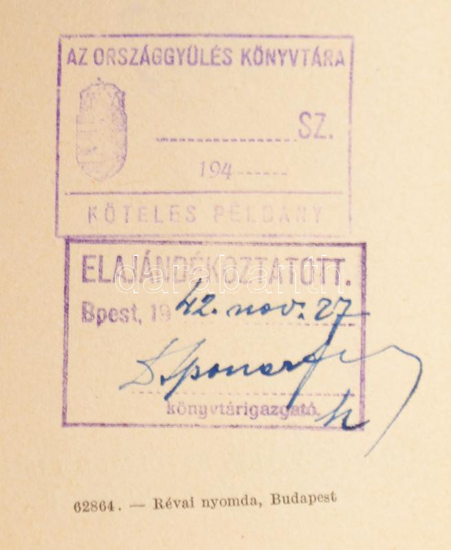 Description: Makkai Sándor: Magyarok csillaga. Bp., Délvidéki Egyetemi és Főiskolai Hallgatók Egyesülete. Országgyűlési Könyvtár elajándékozási bélyegzésével és Sponer (Máriássy) Ferenc k. igazgató aláírásával. Kiadói egészvászon kötés, gerinc ragasztott, viseltes állapotban.