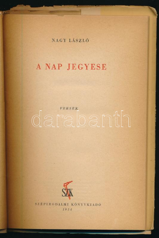 Nagy László: A nap jegyese. 1954, Szépirodalmi. Első kiadás! Megjelent... https://www.darabanth.com/en/466-Online-auction/466.0/Books/Books-Other-rarities~500042/Nagy-Laszlo-A-nap-jegyese-1954-Szepirodalmi-Elso-kiadas-Megjelent-2000-peldanyban-KiadC3~II3142064