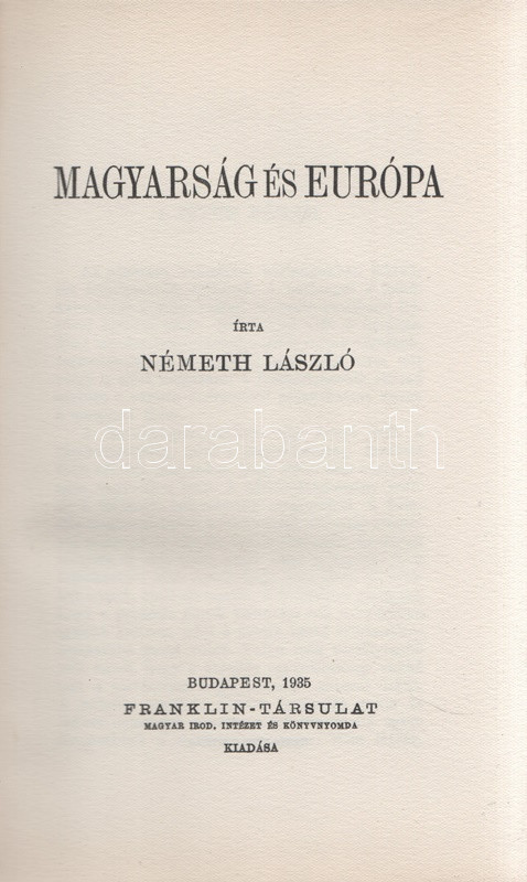 Budapest, 1935. Fr... https://www.darabanth.com/en/466-Online-auction/466.0/Books/Books-Other-rarities~500042/Nemeth-Laszlo-Magyarsag-es-Europa-Tanulmanyok-Budapest-1935-Franklin-Tarsulat-ny-~II3143430