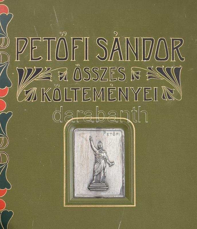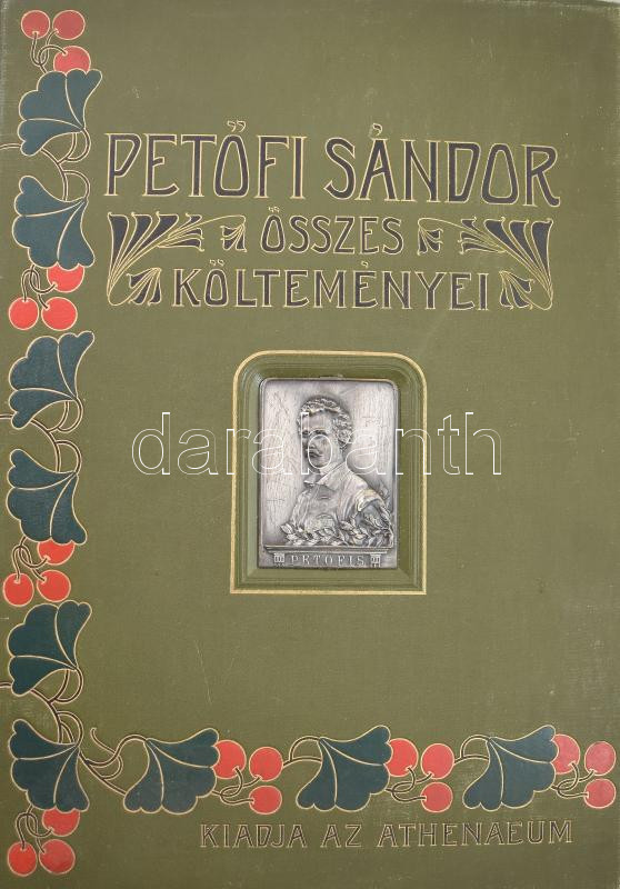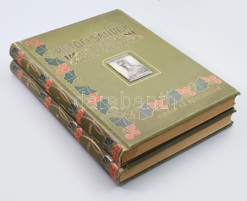 Petőfi Sándor összes költeményei hazai művészek uj rajzaival és a költő arczképével, I.-II. köt. Bp., 1900, Athenaeum, 1 (címkép) t.+4+313+2 p.+9 t.; 1 (címkép) t.+6+312+4[ p.+9 t. Az egész munka irodalmi és művészi berendezését vezette Szana Tamás. Baditz Ottó, Benczúr Gyula, Bihari Sándor, Böhm Pál, Ebner Lajos, Eisenhut Ferencz, Hegedüs László, Kacziány Ödön, Karlovszky Bertalan, Révész Imre, Roskovics Ignácz, Spányi Béla, Vágó Pál, Vastagh Géza, Vaszary János és Wagner Sándor illusztrációival. Kiadói, szecessziós növényi ornamentikával, valamint a költő mellképének és szobrának fémplakettjével díszített, aranyozott festett, aranyozott, zöld egésvászon díszkötésben, aranyozott felső lapélekkel, a borítón és a gerincen kopásnyomokkal, a szennylapokon szakadásokkal, a II. kötetben két lap kötése elcsúszott, ezért felül a szélük kilóg, és a széleiken kissé szakadtak, a plaketteken karcolásokkal.