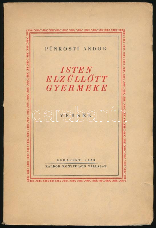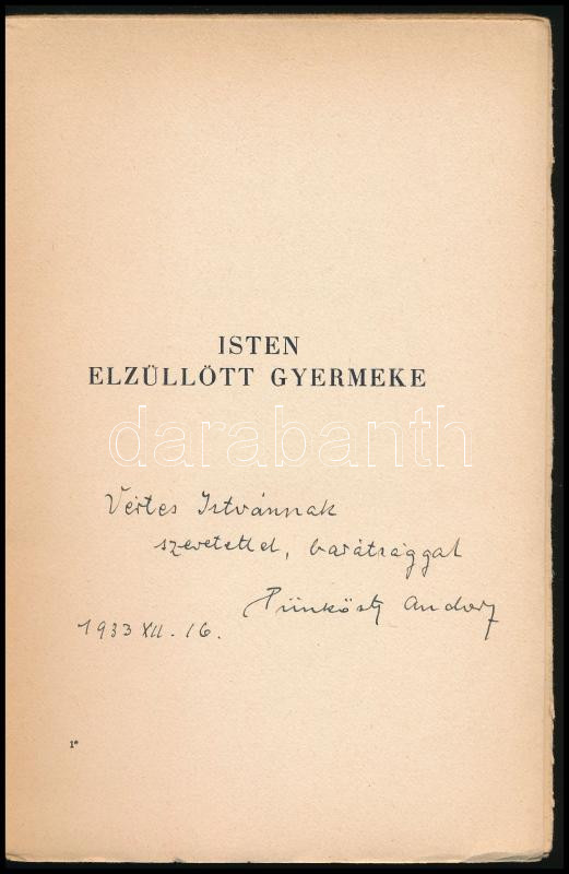 Pünkösti Andor: Isten elzüllött gyermeke. Versek. (DEDIKÁLT). Bp., 1933, Káldor (Globus-ny.), 126 p. Kiadói papírkötés, a borítón kis sérüléssel. A szerző, Pünkösti Andor (1892-1944) író, színikritikus, rendező, színházigazgató által DEDIKÁLT példány.