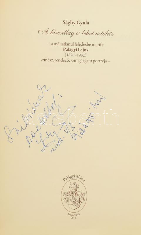 Description: Sághy Gyula: A kiscsillag is lehet üstökös. A méltatlanul feledésbe merült Palágyi Lajos (1876-1932) színész, rendező, színigazgató portréja. (DEDIKÁLT). Bp., 2012, Palágyi Mária (Magánkiadás). Kiadói papírkötés. Számozott (221./1000) példány. Kettős dedikációval: a szerző, Sághy Gyula, ill. a segédszerkesztő és kiadó, Palágyi Mária által DEDIKÁLT példány.