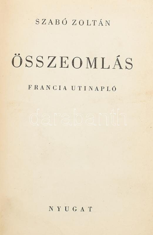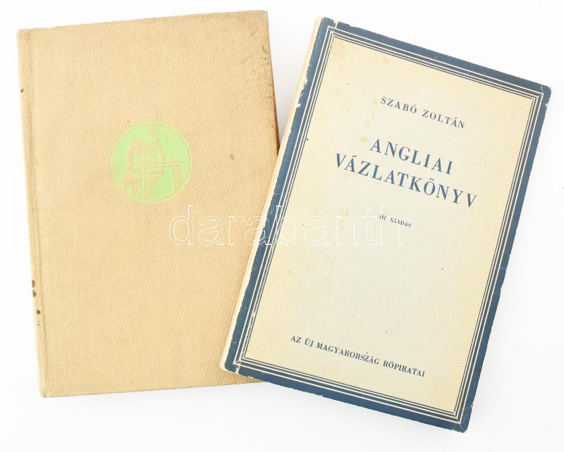 Szabó Zoltán 2 műve: Összeomlás. Francia utinapló. Bp.,(1940), Nyugat, 211+1 p. Első kiadás. Kiadói egészvászon-kötés, kissé kopott, kissé foltos borítóval.; Angliai vázlatkönyv. Az Új Magyarország röpiratai. Bp., 1946., Új Magyarország, 74+4 p. III. kiadás. Kiadói papírkötés, kopott borítóval.