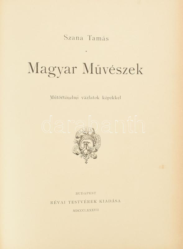 Szana Tamás: Magyar művészek. Műtörténelmi vázlatok képekkel. Bp., 1887, Révai, 8+251+5 p.+15 t. (Műmellékletek.) Első kiadás. Szövegközti és egészoldalas illusztrációkkal. A kötetben Munkácsy Mihály, Benczur Gyula, Zichy Mihály, Mészöly Géza, Jankó János, Aggházy Gyula és mások illusztrációival. Kiadói aranyozott, festett, egészvászon-kötés, aranyozott lapélekkel, kissé foltos, kissé kopott borítóval, néhány hiányzó hártyapapírral.