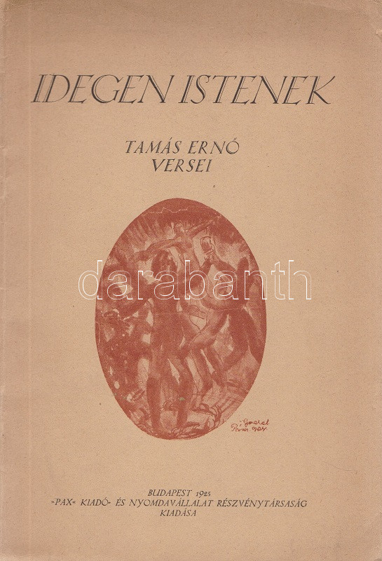 Tamás Ernő: Idegen istenek. Tamás Ernő versei. Budapest, 1925. ,,Pax" Kiadó- és Nyomdavállalat Rt. 31 + [1] p. Egyetlen kiadás. Dedikált: ,,Tombor Tibor pályatársamnak mély rokonszenvvel: Tamás Ernő." Néhány oldalon lapszéli korrektúrajelek, vélhetően a tulajdonos-szerkesztő keze által. Poss.: Poss.: Tombor Tibor (dedikáció). [Tombor Tibor (1909-2000) bibliográfus, szerkesztő, a Magyar Könyvszemle munkatársa, számos könyvtárügyi szakmunka szerzője.] Fűzve, Goebel Jenő rajzával illusztrált kiadói borítóban. Körülvágatlan, jó példány.