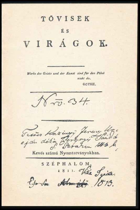 Tövisek és virágok. Széphalom, 1811. Hasonmás kiadás. Megjelent 600 pé...