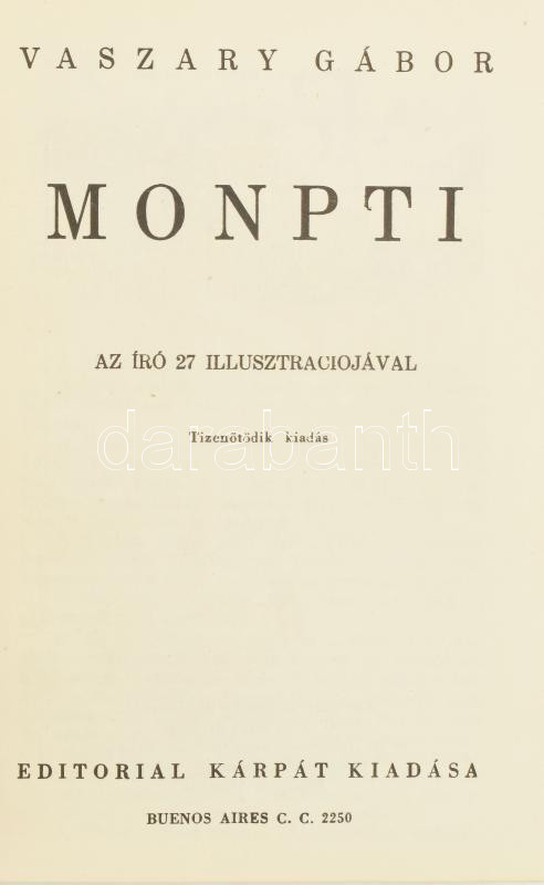 https://www.darabanth.com/en/466-Online-auction/466.0/Books/Books-Other-rarities~500042/Vaszary-Gabor-Montpi-Buanos-Aires-1955-Editorial-Karpat-kopott-egeszvaszon-kotes~II3140555
