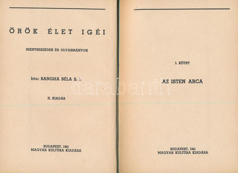 Bangha Béla: Örök élet igéi. Szentbeszédek és olvasmányok. I. köt.: Is... https://www.darabanth.com/en/466-Online-auction/466.0/Books/Books-Religion~2000335/Bangha-Bela-Orok-elet-igei-Szentbeszedek-es-olvasmanyok-I-kot-Isten-arca-Bp-1941-~II3143198