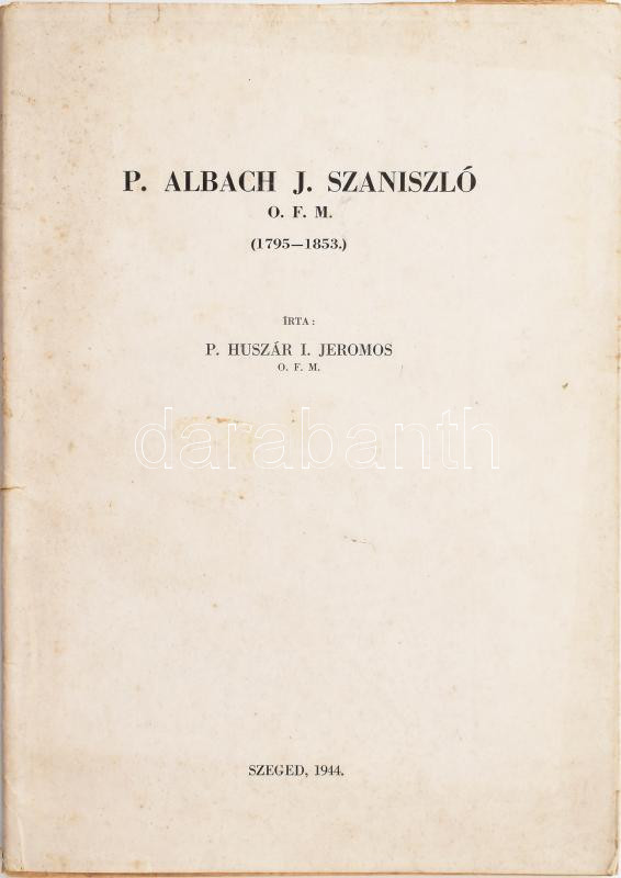 Huszár I(mre) Jeromos: P. Albach J[ózsef] Szaniszló O. F. M. (1795-185... https://www.darabanth.com/en/466-Online-auction/466.0/Books/Books-Religion~2000335/Huszar-Imre-Jeromos-P-Albach-Jozsef-Szaniszlo-O-F-M-1795-1853-Szeged-1944-Ferences~II3080010