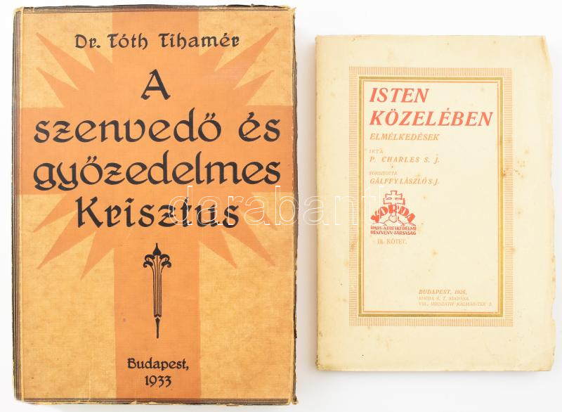 Description: P. Charles S. J.: Isten közelében. Elmélkedések. III. kötet. Ford.: Gálffy László S. J. Bp., 1926, Korda Rt. Kiadói papírkötés, kissé foltos borítóval. + Tóth Tihamér: A szenvedő és győzedelmes Krisztus. Szentbeszédek, melyeket a Pázmány-Egyetem templomában elmondott: Dr. - -. Bp.,1934., "Élet". Kiadói papírkötés.