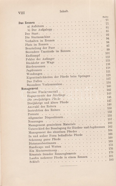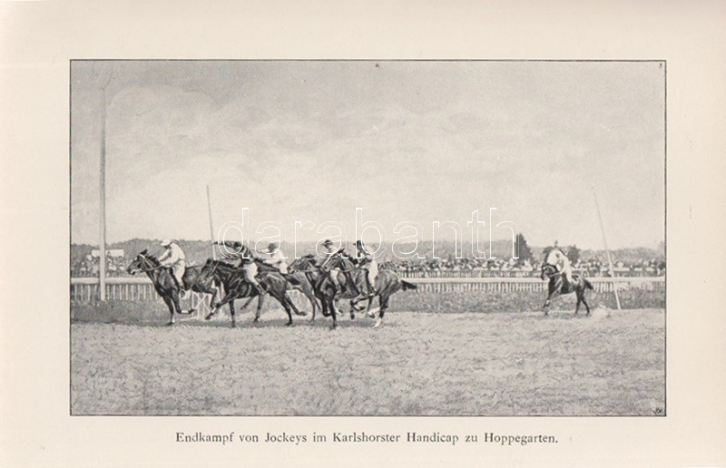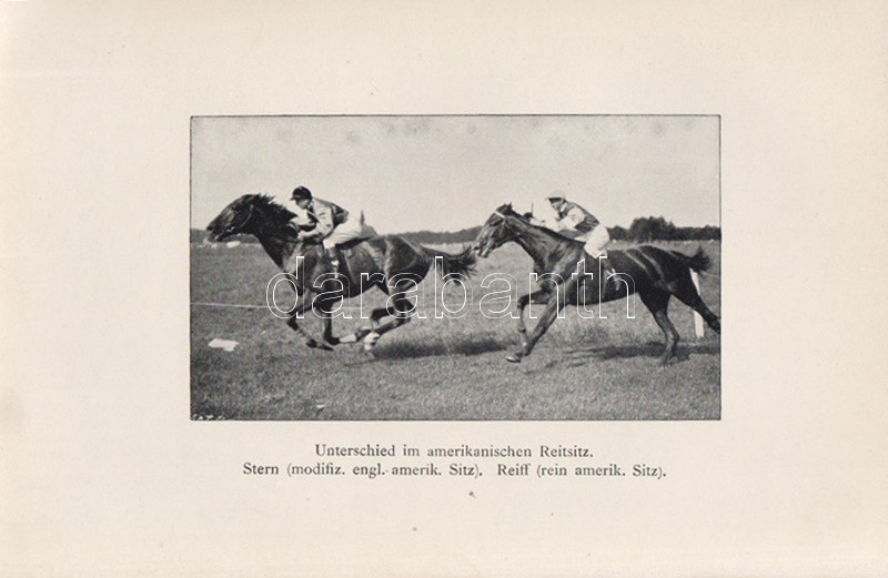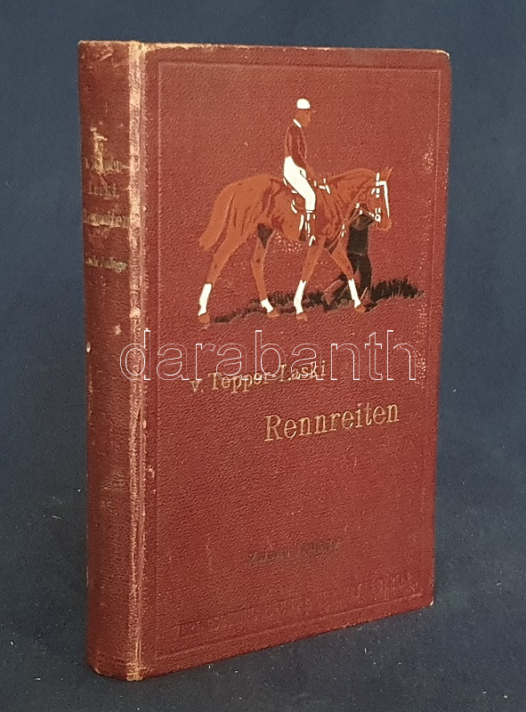 Tepper-Laski, K[urt] von: Rennreiten. Praktische Winke für Rennreiter und Manager. Zweite, verbesserte Auflage. Berlin, 1903. Verlagsbuchhandlung Paul Parey (Pierersche Hofbuchdruckerei Stephan Geibel & Co., Altenburg). 1 t. (címképen Heinrich von Rosenberg német lovassági tábornok portréja) + X + 184 + [6] p. + 26 t. Kurt von Tepper-Laski (1850-1931) német sportlovas, író, újságíró bevezetése a lovassport és a lóverseny részleteibe. A munka eredeti nyelven először 1897-ben jelent meg, táblái képanyagában döntően korabeli lóverseny-pillanatok. Az első előzéken régi tulajdonosi bejegyzés. Aranyozott, festett, vaknyomásos, enyhén kopott kiadói vászonkötésben. Jó példány.