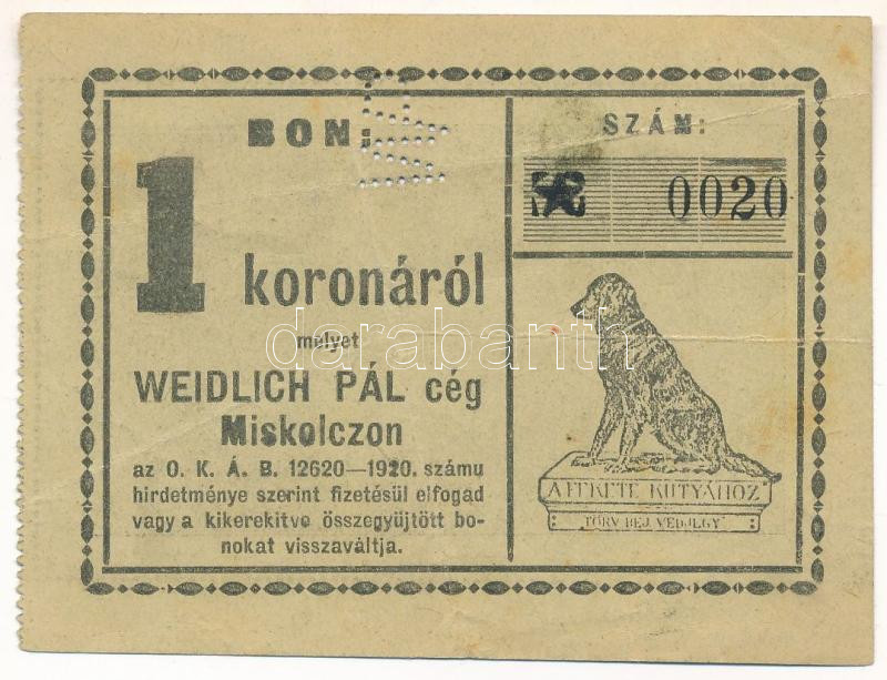 https://www.darabanth.com/en/466-Online-auction/466.0/Numismatics/Emergency-Coins-and-Notes~1500007/Miskolc-7E1920-Weidlich-Pal-ceg-Miskolczon-1K-erteku-bon-WP-perforacioval-0020-sorszC3~II3146255