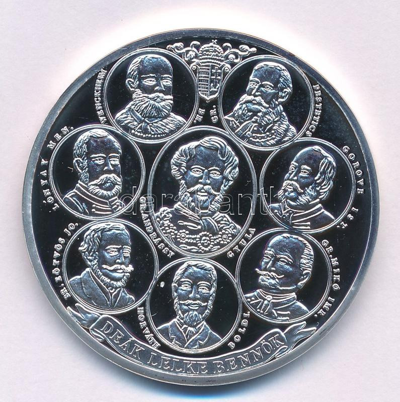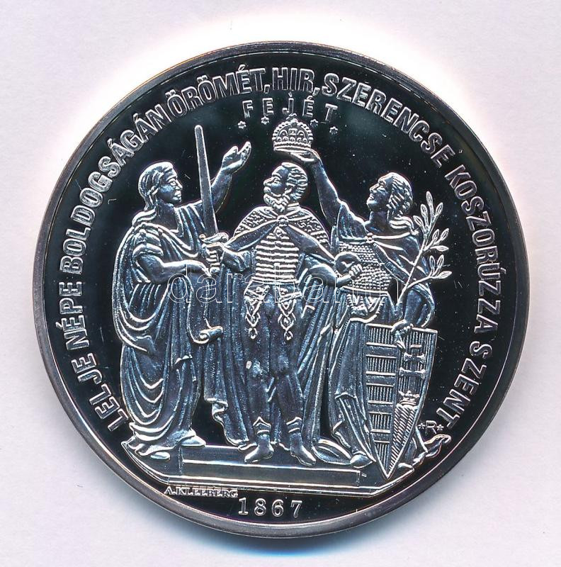 1867. "I. Ferenc József budai koronázására" ezüstözött fém emlékérem "R" jelzésű replika. "LELJE NÉPE BOLDOGSÁGÁN ÖRÖMET, HÍR, SZERENCSE KOSZORÚZZA SZENT FEJÉT / DEÁK EMLÉKE BENNÖK". Szign.: August Kleeberg (46mm) T:PP patina