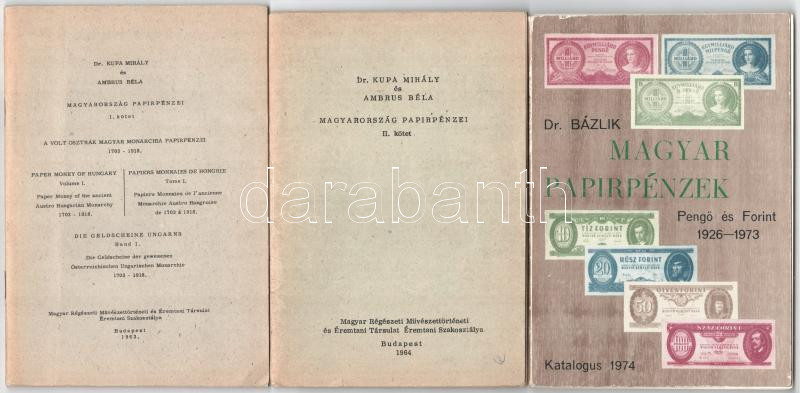 Description: Dr. Kupa Mihály - Ambrus Béla: Magyarország papírpénzei I. és II. kötet. Budapest, Magyar Régészeti Művészettörténeti és Éremtani Társulat Éremtani Szakosztálya, 1963. és 1964., mindkettő papírkötés, használt, de jó állapotban + Dr. Bázlik László György: Magyar Papírpénzek - Pengő és Forint 1926-1973. Katalógus. Budapest 1974. A szerző által dedikált példány! Használt állapotban, a borító kopottas.