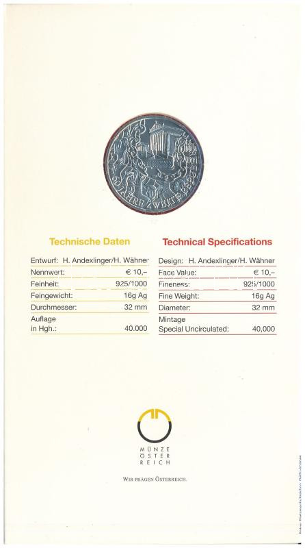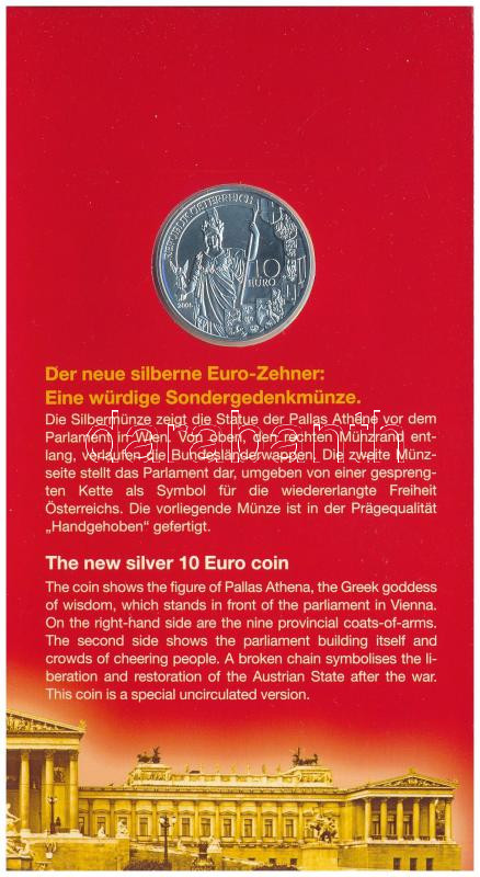Austria 2005. 10 Euro Ag "60th Anniversary of the Second Republic" on cardboard display sheet C:BU