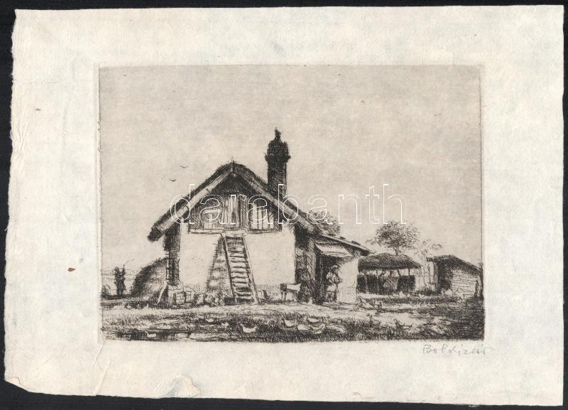 Boldizsár István (1897-1984): Tanya. Rézkarc, papír, jelzett, lapszéli kisebb felületi sérüléssel, rézkarc ép, 14,5x20 cm