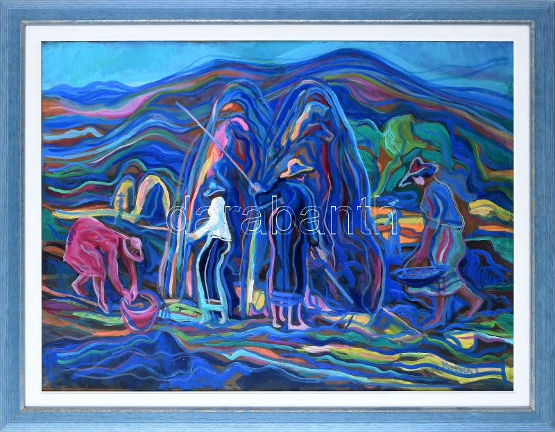 Description: Kozma István (1937-2020): Társaság (cím nélkül). Olaj, vászon, jelezve jobbra lent, 60×80 cm. Fakeretben. / István Kozma (1937-2020): Company (untitled). Oil on canvas, signed lower right. 60×80 cm. Framed
