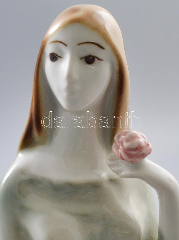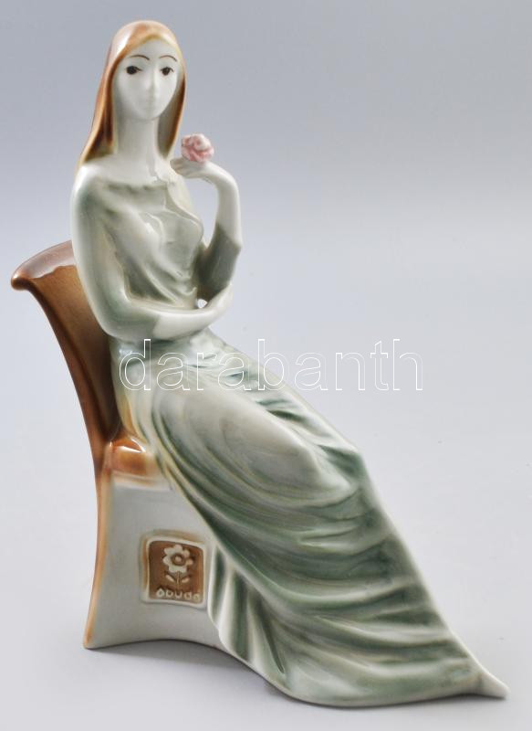 Zsolnay széken ülő nő virággal. Jelzett, hibátlan, m: 22,5 cm