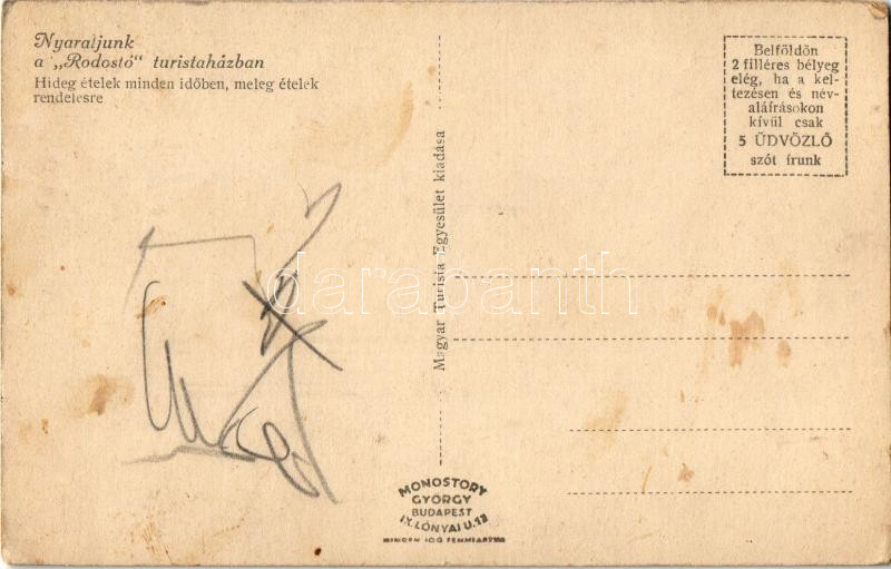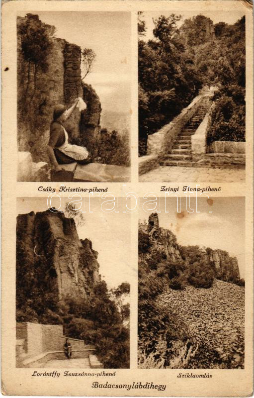 Badacsonylábdihegy, Csáky Krisztina, Zrínyi Ilona és Lorántffy Zsuzsanna pihenő, sziklaomlás. Rodostó turistaház reklám a hátoldalon (EK)