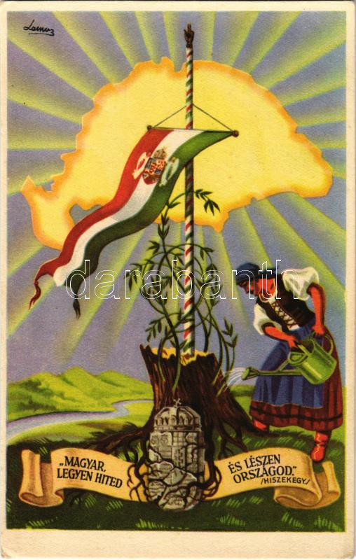 Description: Magyar legyen hited és lészen országod. Hiszekegy. Kiadja az Ereklyés Országzászló Nagybizottsága / Hungarian irredenta propaganda, Hungarian flag, Trianon s: Lamoss (EK)