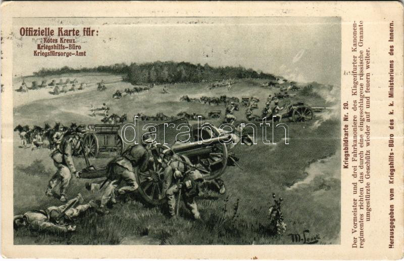 1914 Kriegsbildkarte Nr. 20. Der Vormeister und drei Fahrkanoniere des Klagenfurter Kanonenregimentes richten das durch eine eingeschlagene russische Granate umgestürzte Geschütz wieder auf und feuern weiter. Kriegshilfsbüro / WWI Austro-Hungarian K.u.K. military art postcard. Artillerymen of the Klagenfurt Artillery Regiment set up the cannon overturned by a Russian grenade and continue firing s: M. Ledeli (EK)