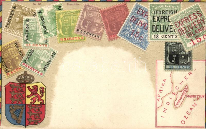 Mauritius - set of stamps, Ottmar Zieher's Carte Philatelique No. 89. litho (cut?)