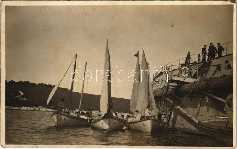 SMS PRINZ EUGEN Osztrák-Magyar Haditengerészet pre-dreadnought csatahajó matrózai vitorláscsónakokban / K.u.K. Kriegsmarine / Austro-Hungarian Navy ironclad warship's mariners in sailing boats. photo (fl)