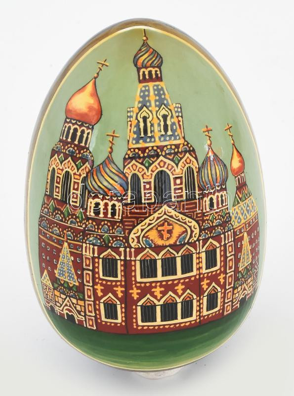 1995 Orosz lakkfestett fa tojás, a Boldog Vazul-székesegyház ábrázolásával, jelzett, m: 9,5 cm