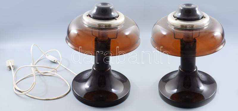 Kováts Sándor (Borz) designer (1940-1973): Asztali lámpa pár. cca 1970/75, műanyag, fém, üveg búrák, Iparművészeti Vállalatos zsűricímke, minimális kopottsággal, m: 36 cm